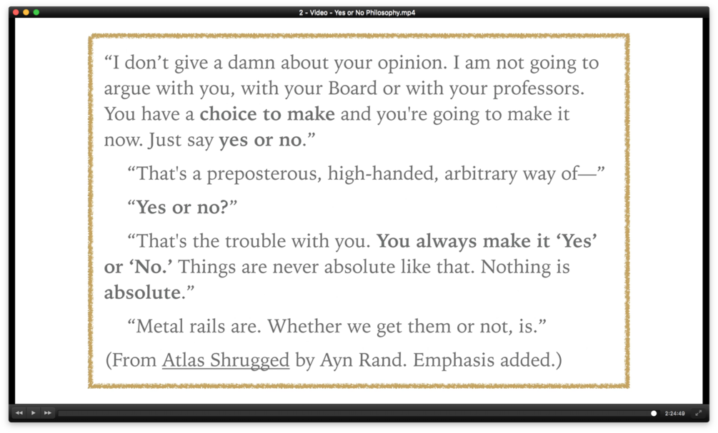 A process of reason is a process of constant choice in answer to the question: True or False?—Right or Wrong? Is a seed to be planted in soil in order to grow—right or wrong? Is a man's wound to be disinfected in order to save his life—right or wrong? Does the nature of atmospheric electricity permit it to be converted into kinetic power—right or wrong? It is the answers to such questions that gave you everything you have—and the answers came from a man's mind, a mind of intransigent devotion to that which is right. – John Galt in Atlas Shrugged by Ayn Rand (more quotes)